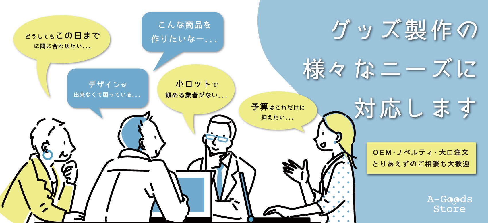 「こんな商品を作りたい」 「デザイナーがいなくてデザインが出来ない」 「どうしてもこの日までに間に合わせたい」 「予算はこれだけに抑えたい」 「小ロットで頼める業者がない」「思った通りの商品ができるか不安」などなど、様々なニーズにお応え致します。まずはお気軽にお問い合わせください。