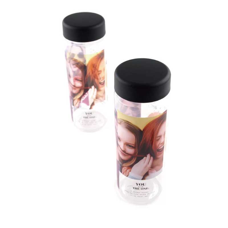 お気に入りの写真・イラスト・名入れなどをクリアボトルにぐるっと全面プリント可能です。 他では作れないオリジナルリティあふれるクリアボトルを1個から作成頂けます。